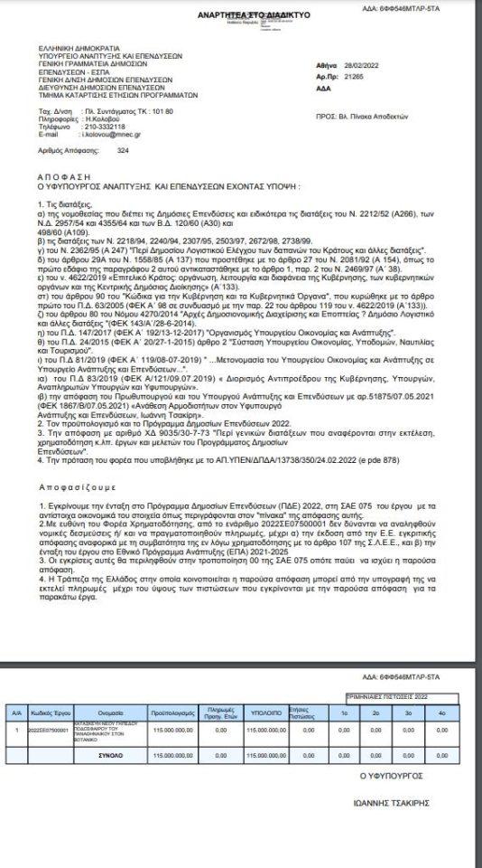 Το έγγραφο που αναρτήθηκε στη Διαύγεια φέρει την υπογραφή του υφυπουργού Ανάπτυξης, Ιωάννη Τσακίρη και έχει κοινοποιηθεί στον Δήμο Αθηναίων.