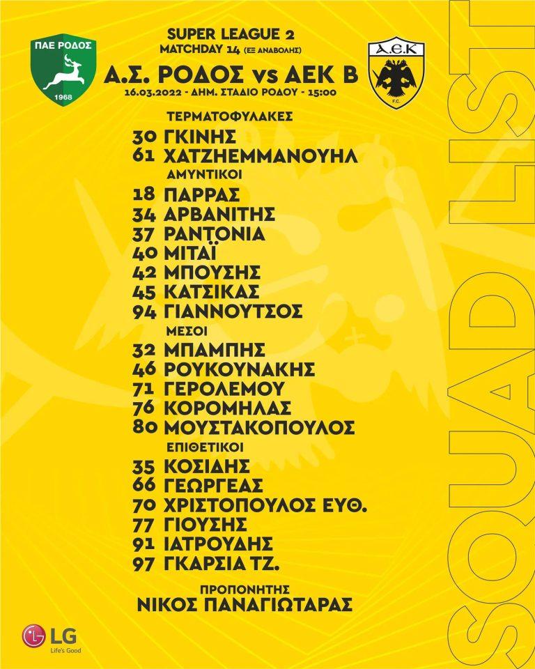 ΑΕΚ Β’: Η αποστολή κόντρα στην Ρόδο για την 14η αγωνιστική της Super League 2