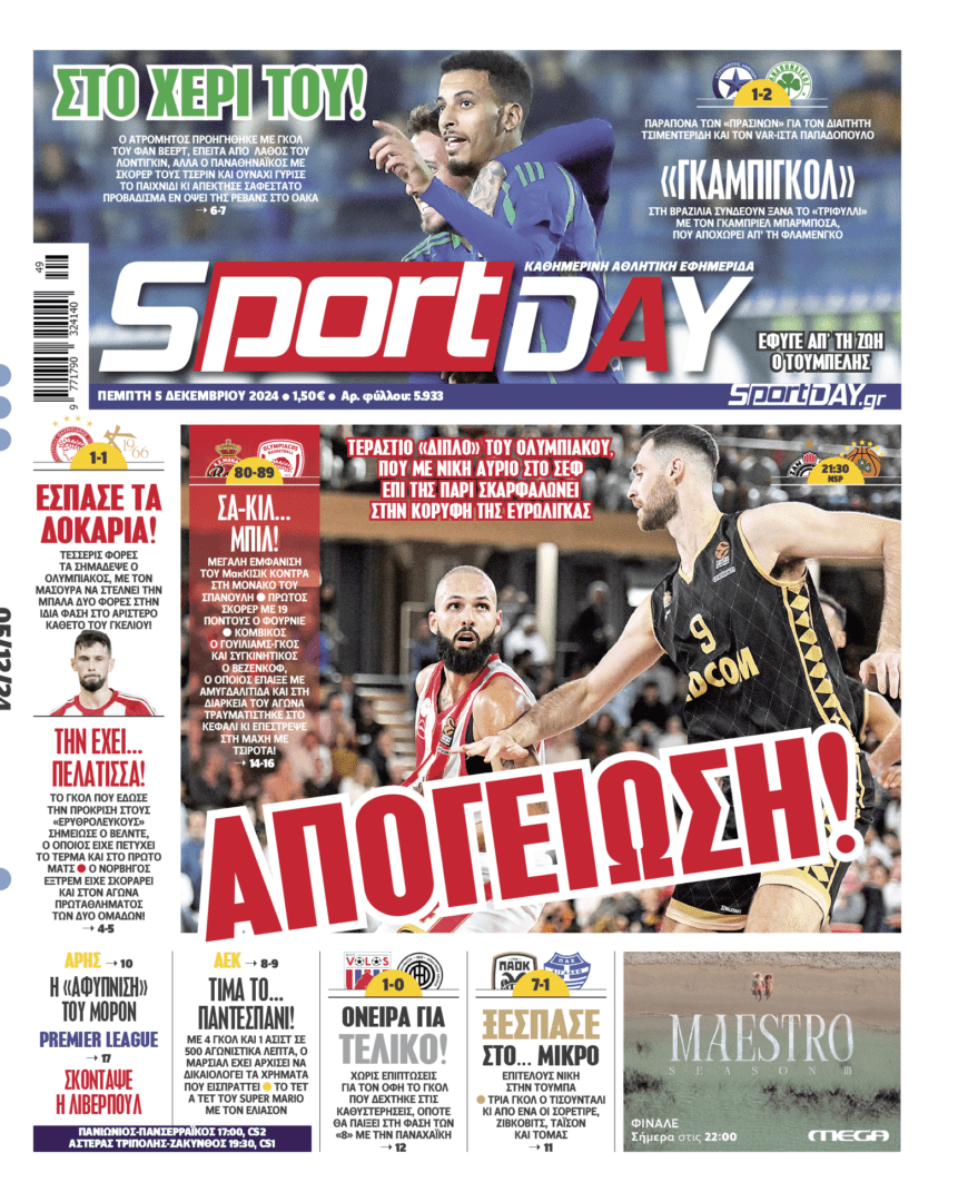 Πρωτοσέλιδο SPORTDAY - Πέμπτη 5 Δεκεμβρίου 2024 Το πρωτοσελίδo της ημέρας από το αρχείο της SportDay. Διαβάστε στην SportDay: ΑΠΟΓΕΙΩΣΗ ΕΣΠΑΣΕ ΤΑ ΔΟΚΑΡΙΑ ΣΤΟ ΧΕΡΙ ΤΟΥ ΞΕΣΠΑΣΕ ΣΤΟ… ΜΙΚΡΟ Άρθρα της SportDay στο Sportday.gr: ΠΑΟΚ Παρασκήνιο: Η άδεια Τούμπα ανησυχείΓιώργος Χελάκης: Όταν παίζεις με αντίπαλο την Καλλιθέα, είναι ανάγκη να ξεκαπνίσεις ΑΡΧΕΙΟ: ΙΑΝΟΥΑΡΙΟΣΦΕΒΡΟΥΑΡΙΟΣΜΑΡΤΙΟΣΑΠΡΙΛΙΟΣΜΑΙΟΣΙΟΥΝΙΟΣΙΟΥΛΙΟΣΑΥΓΟΥΣΤΟΣΣΕΠΤΕΜΒΡΙΟΣΟΚΤΩΒΡΙΟΣΝΟΕΜΒΕΡΙΟΣΔΕΚΕΜΒΡΙΟΣ 2025202420232022202120202019201820172016201520142013201220112010