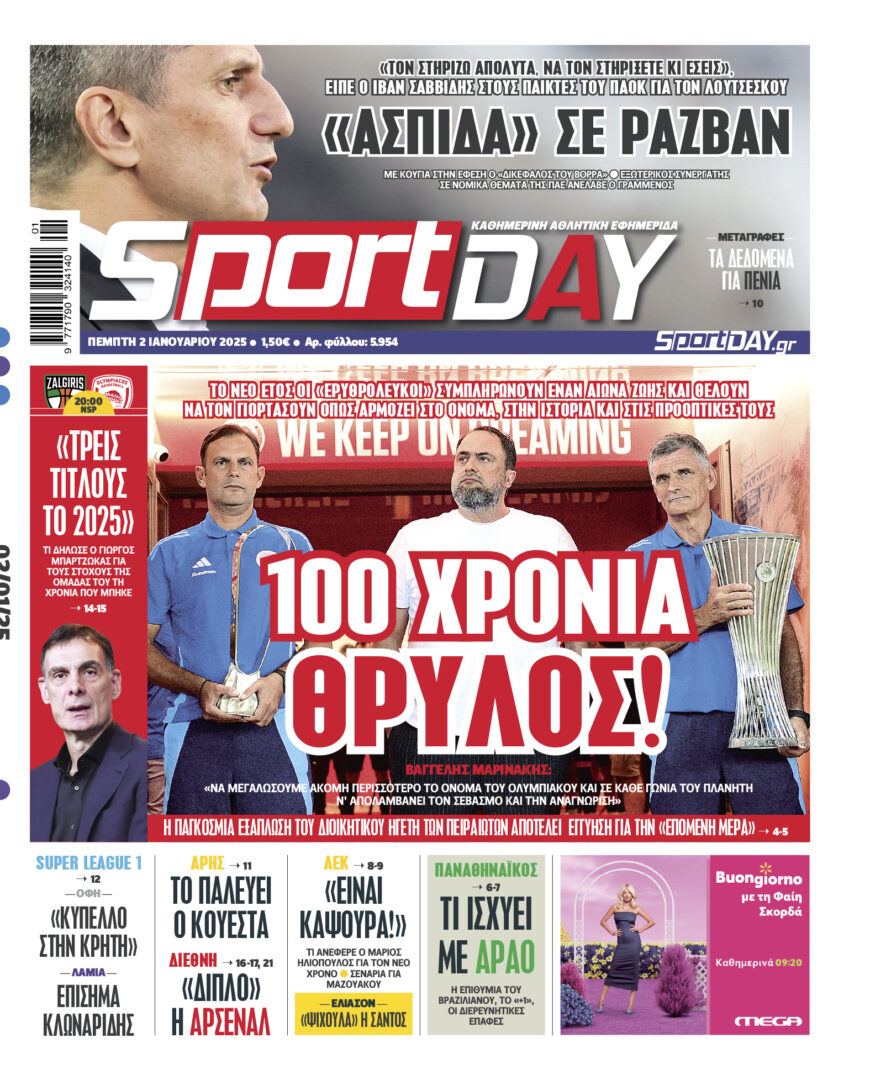 Πρωτοσέλιδο SPORTDAY - Πέμπτη 2 Ιανουαρίου 2025 Το πρωτοσελίδo της ημέρας από το αρχείο της SportDay. Διαβάστε στην SportDay: 100 χρόνια Θρύλος «Ασπίδα» σε Ραζβάν «Τρεις τίτλους το 2025» Άρθρα της SportDay στο Sportday.gr: ΑΕΚ Παρασκήνιο: Γκρίνια για τον ΡιμπάλταΟλυμπιακός Μεταγραφές: Παραμένει ψηλά ο ΣόσαΠαναθηναϊκός: Να μη γίνει σήριαλ του Αράο ΑΡΧΕΙΟ: ΙΑΝΟΥΑΡΙΟΣΦΕΒΡΟΥΑΡΙΟΣΜΑΡΤΙΟΣΑΠΡΙΛΙΟΣΜΑΙΟΣΙΟΥΝΙΟΣΙΟΥΛΙΟΣΑΥΓΟΥΣΤΟΣΣΕΠΤΕΜΒΡΙΟΣΟΚΤΩΒΡΙΟΣΝΟΕΜΒΕΡΙΟΣΔΕΚΕΜΒΡΙΟΣ 2025202420232022202120202019201820172016201520142013201220112010