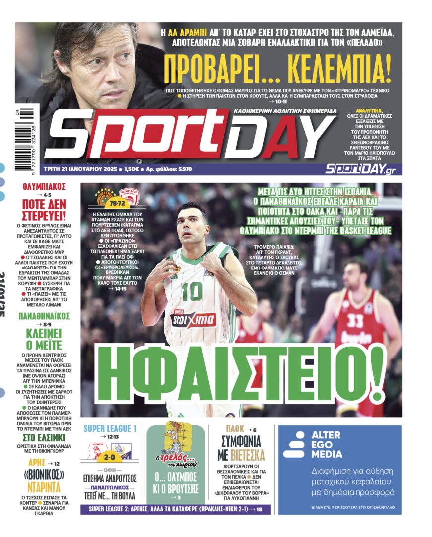 Πρωτοσέλιδο SPORTDAY - Τρίτη 21 Ιανουαρίου 2025 Το πρωτοσελίδo της ημέρας από το αρχείο της SportDay. Διαβάστε στην SportDay: Ηφαίστειο Ο Αλμέιδα προβάρει κελεμπία! Κλείνει ο Μεϊτέ Εκλεισε Βιετέσκα, συνεχίζει με Πέλκα Άρθρα της SportDay στο Sportday.gr: Παναθηναϊκός Μεταγραφές: Κλείνει τον Μεϊτέ – Τι απομένει για το οριστικό dealΟλυμπιακός: Η Λερναία Υδρα του ΜεντιλίμπαρΑρης: Νταρίντα, ο… βιονικός ΤσέχοςΓιάννης Βρούτσης: Η παράνομη παρέμβαση υπέρ του Καπράλου και ο… Ολυμπος ΑΡΧΕΙΟ: ΙΑΝΟΥΑΡΙΟΣΦΕΒΡΟΥΑΡΙΟΣΜΑΡΤΙΟΣΑΠΡΙΛΙΟΣΜΑΙΟΣΙΟΥΝΙΟΣΙΟΥΛΙΟΣΑΥΓΟΥΣΤΟΣΣΕΠΤΕΜΒΡΙΟΣΟΚΤΩΒΡΙΟΣΝΟΕΜΒΕΡΙΟΣΔΕΚΕΜΒΡΙΟΣ 2025202420232022202120202019201820172016201520142013201220112010