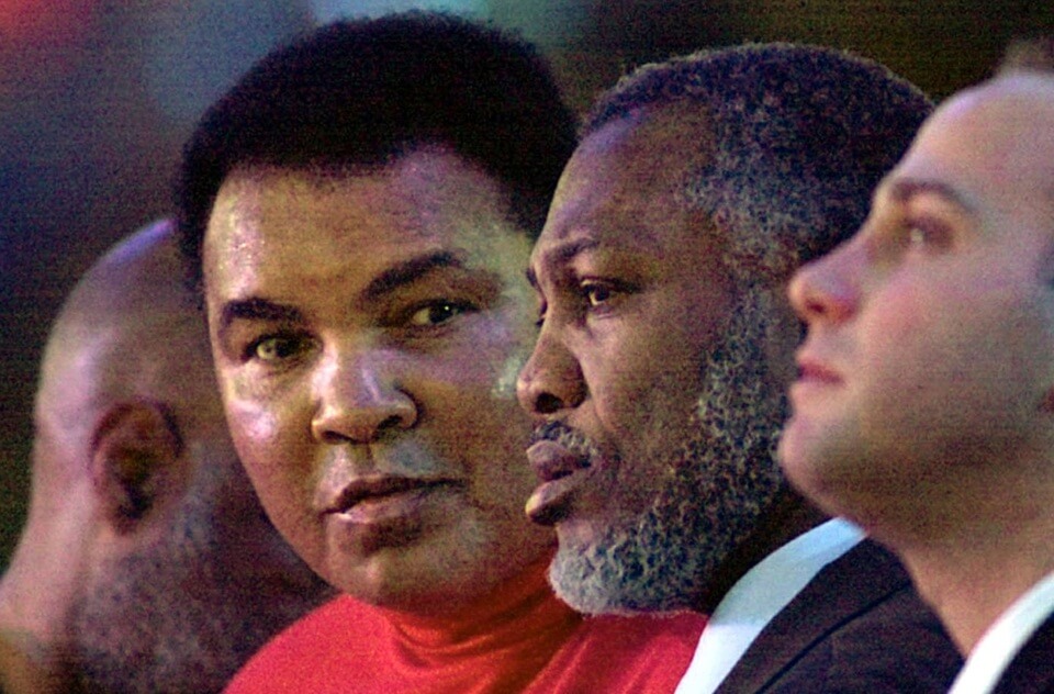 Ο Αλί και ο Φρέιζερ σε μία από τις σπάνιες κοινές εμφανίσεις τους, στο All Star Game του μπάσκετ το 2002.