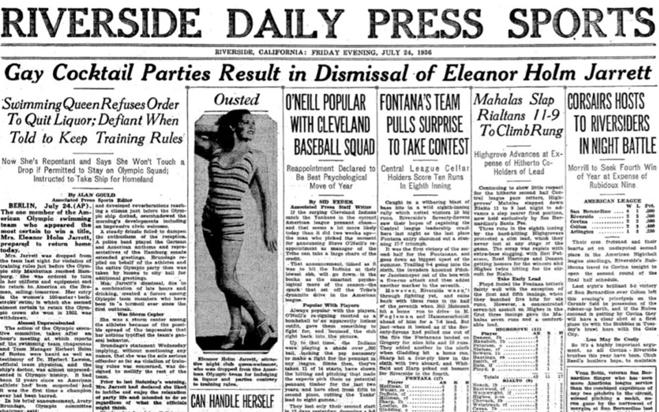 Η είδηση του αποκλεισμού της Χολμ στη «Riverside Daily Press» της 24ης Ιουλίου 1936. «Τα χαρωπά πάρτι με τα κοκτέιλ κόστισαν την αποβολή της Έλινορ Χολμ-Τζάρετ», γράφει ο βασικός τίτλος, ενώ η φωτογραφία της συνοδεύεται με τη λέξη «εκδιώχθηκε».