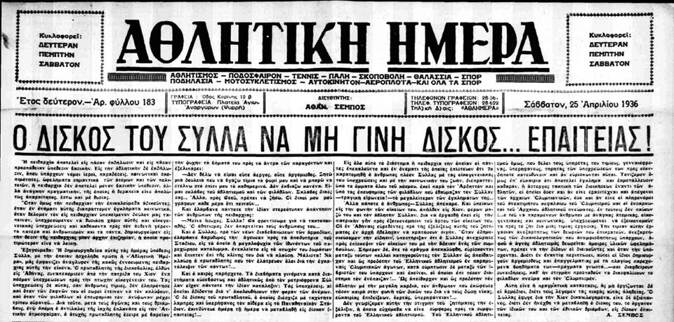 Το πρωτοσέλιδο άρθρο του Αθανάσιου Σέμπου για τη διαμάχη Σύλλα-ΣΕΓΑΣ, στην «Αθλητική Ημέρα» της 25ης Απριλίου 1936.