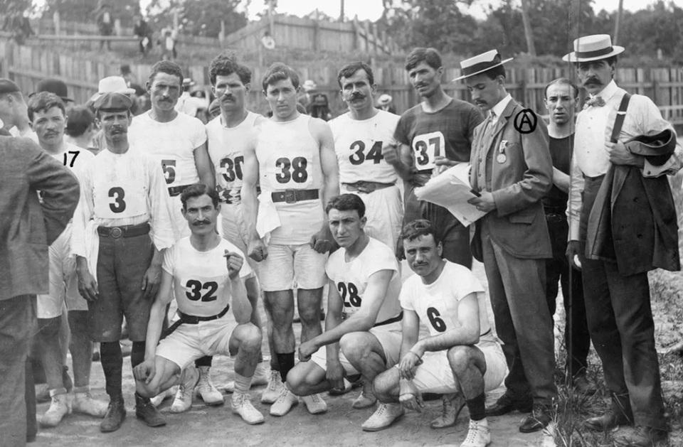 Εννιά από τους δέκα Ελληνοαμερικανούς αθλητές ποζάρουν μαζί με τον Φέλιξ Καρβαχάλ (Νο 3) πριν την εκκίνηση του Μαραθωνίου. Σύμφωνα με τη Wikipedia, με το Νο 32 είναι ο Χαρίλαος Γιαννακάς και με το Νο 6 ο Χρήστος Ζεχουρίτης.