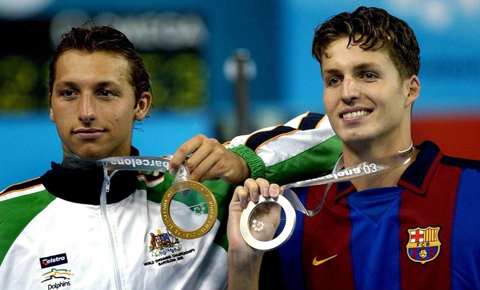 Ο Θορπ δίπλα στον αιώνιο αντίπαλό του, Πίτερ Φαν Ντεν Χόχενμπαντ, ύστερα από τη νίκη εναντίον του στα 200 μέτρα ελεύθερο στο Παγκόσμιο Πρωτάθλημα του 2003 στη Βαρκελώνη (πηγή: Eurokinissi).