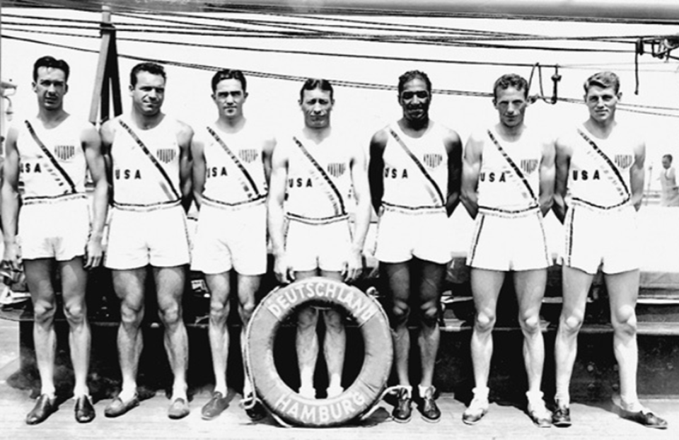 Με συναθλητές του στην εθνική ομάδα των ΗΠΑ, στο πλοίο με το οποίο ταξίδεψαν στο Αμβούργο για τους Ολυμπιακούς Αγώνες του 1936. Ο Κάνινγκαμ διακρίνεται στο μέσον, πίσω απ’ το σωσίβιο (πηγή: Glenn Cunningham: Never Quit).