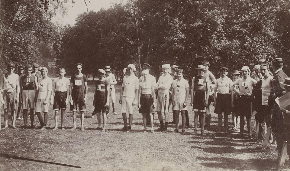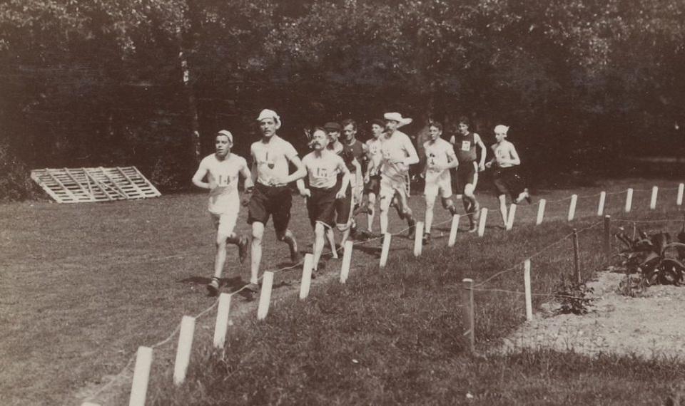 Το γκρουπ των προπορευόμενων του Μαραθωνίου του 1900, σε στιγμιότυπο που λογικά λήφθηκε μερικά λεπτά μετά την εκκίνηση. Προπερευόμενος είναι ο Σουηδός Φαστ, ενώ ο Τεατό διακρίνεται προτελευταίος (πηγή: Συλλογή Jules Beau).