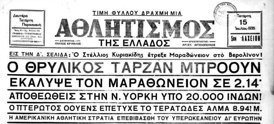 Ο πρωτοσέλιδος τίτλος της εφημερίδας «Αθλητισμός» της 15ης Ιουλίου 1936 αποθεώνει τον Μπράουν, αν και ο χρόνος που ισχυρίζεται ότι είχε κάνει στον Μαραθώνιο (2 ώρες και 14 λεπτά) είναι εντελώς αναληθής. Το ίδιο ισχύει φυσικά και για το άλμα στα 8.94 μ. που δήθεν είχε κάνει ο Τζέσι Όουενς στο μήκος. Όπως βλέπετε, επίσης, στην Ελλάδα ανέφεραν τότε τους Ινδιάνους ως «Ινδούς»! (πηγή: Ψηφιακή Βιβλιοθήκη της Βουλής).