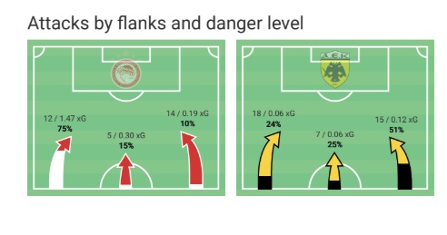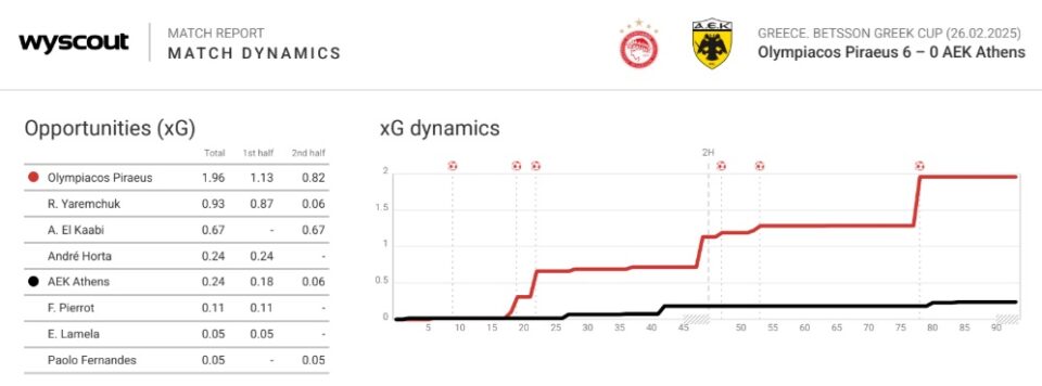 Από την άλλη μεριά, αυτά τα έξι τέρματα του Ολυμπιακού, προήλθαν από συνολικά 12 τελικές ευκαιρίες και 6 στον στόχο. Δηλαδή, αν και δεν έγιναν συνολικά πολλές τελικές προσπάθειες και ο δείκτης των XGoals ήταν στο 1.96, ήτοι 2 γκολ για τους «ερυθρόλευκους», εκείνοι κατάφεραν να σκοράρουν 6(!) φορές.