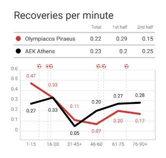 Ενα επίσης ενδιαφέρον στατιστικό, είναι αυτό της ανακατάληψης της κατοχής της μπάλας ανά λεπτό, με τους γηπεδούχους να κλέβουν σχεδόν… μισή μπάλα ανά λεπτό, δηλαδή να έχουν μέσο όρο 1 κλέψιμο της μπάλας ανά 2 αγωνιστικά λεπτά το διάστημα στο οποίο πέτυχαν τα 3 πρώτα γκολ, που ήταν και… καταδικαστικά για την έκβαση της αναμέτρησης.