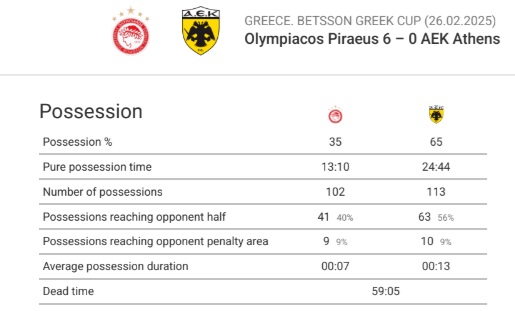 Ένα ακόμα ενδιαφέρον στοιχείο της αναμέτρησης, είναι η ποσοστιαία κατοχή της μπάλας σε συνάρτηση με τις συνολικές κατοχές που είχαν οι δύο ομάδες. Ο Ολυμπιακός είχε 35% κατοχή, έχοντας 102 φορές την μπάλα στα πόδια του, ενώ η ΑΕΚ είχε 65% κατοχή έχοντας σε μόλις 11 παραπάνω φορές την μπάλα στα πόδια της (113). Οι γηπεδούχοι είχαν συνολικά στην κατοχή τους την μπάλα για 13:10, δείχνοντας πόσο άμεσα λειτουργούν, εκτελώντας τις επιθέσεις τους μέσα σε δευτερόλεπτα, ενώ οι φιλοξενούμενοι την είχαν για σχεδόν το διπλάσιο χρόνο (24:44). Το ποδόσφαιρο έχει γίνει πλέον πολύ γρήγορο άθλημα. Επίσης, ο «νεκρός» χρόνος παιχνιδιού ανήλθε στην μία ολόκληρη ώρα (59:05), προϊόντος και του σκορ που ξέφυγε.