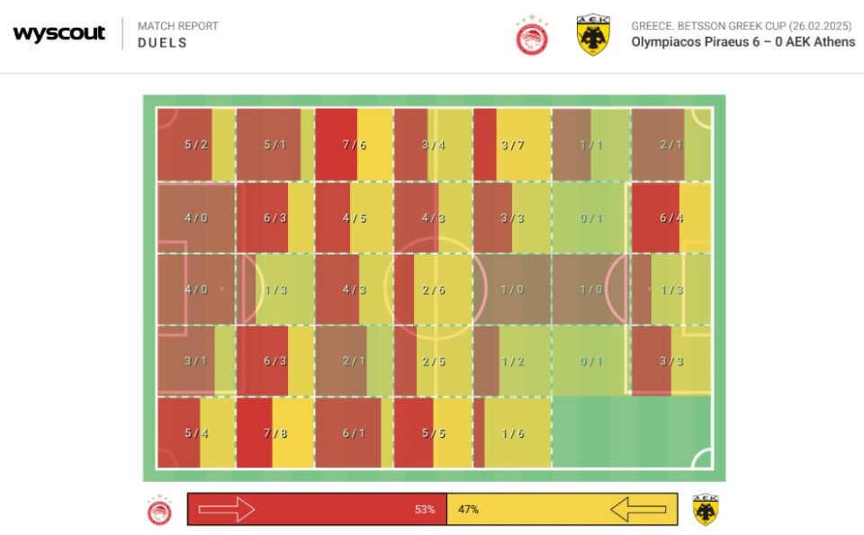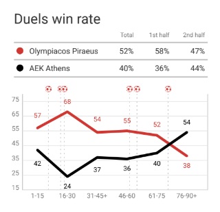 Επίσης, ο Ολυμπιακός στο μεγαλύτερο διάστημα της αναμέτρησης, κέρδισε κατά κράτος σε ποσοστό επί τις εκατό τις μονομαχίες από την ΑΕΚ.