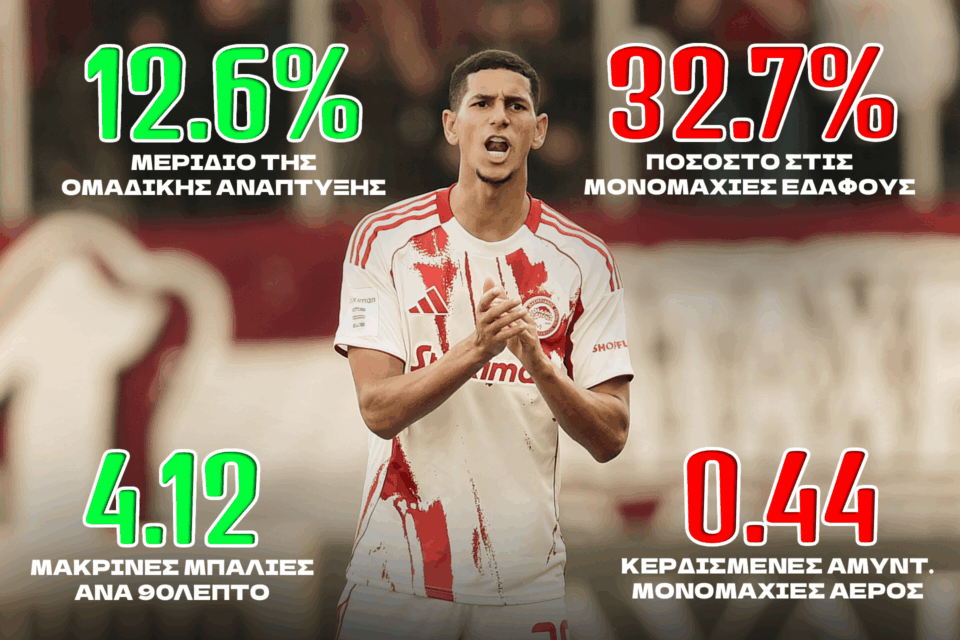Αντίθετα, ξεχωρίζει για παράδειγμα στο μερίδιο της ομαδικής ανάπτυξης με 12.6%, ποσοστό καλύτερο από αυτό του 87% των στόπερ στα μεγάλα πρωταθλήματα. Εξίσου σπάνιες είναι και οι 4.12 μακρινές μπαλιές ανά 90λεπτο, όπως και οι 4.25 προωθητικές μπαλιές.