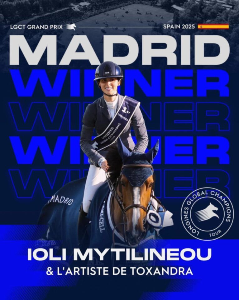 Το Grand Prix της Μαδρίτης στο πλαίσιο του Longines Global Champions Tour κρίθηκε μετά από έναν αγώνα με επτά ιππείς. Τελικά, η Ιόλη Μυτιληναίου εξέπληξε τους πάντες με μια νίκη, ύστερα από μια φανταστική διαδρομή με τον L’Artiste de Toxandra! Για την Ιόλη, αυτή ήταν η πρώτη της νίκη σε Grand Prix επιπέδου CSI5*…