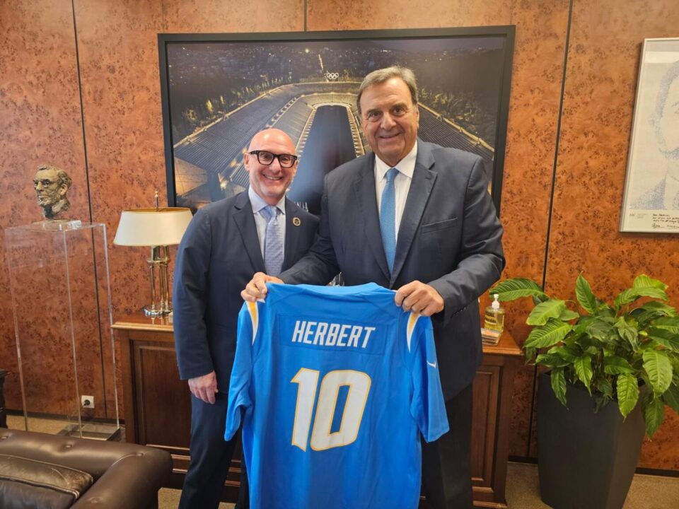 Στο τέλος της συνάντησης ο Fred Maas έδωσε συμβολικά στον κ. Κούβελο ως αναμνηστικό δώρο, τη φανέλα των LA Chargers με τον αριθμό 10 που φορά ο καλύτερος παίκτης της ομάδας, ο Justin Herbert.