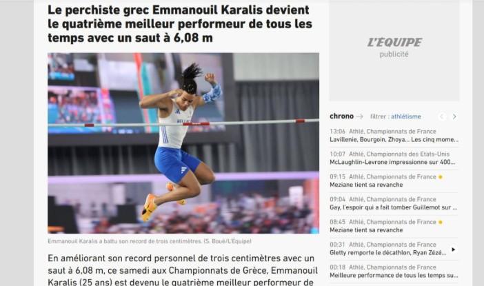 Το τεράστιο άλμα του Καραλή στο επί κοντώ έγινε γνωστό και εκτός συνόρων, με την Γαλλική «L’ Equipe» να το κάνει θέμα