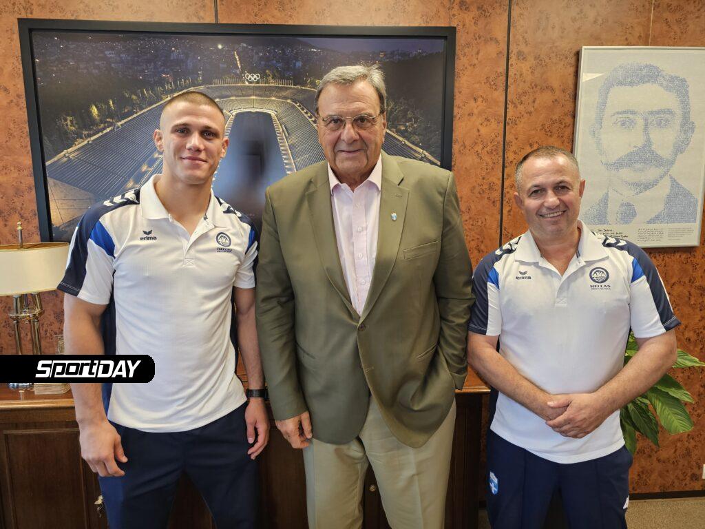 Ο Πρόεδρος της Ελληνικής Ολυμπιακής Επιτροπής Ισίδωρος Κούβελος υποδέχθηκε στην Ελληνική Ολυμπιακή Επιτροπή τον Παγκόσμιο Πρωταθλητή της πάλης Γιώργο Κουγιουμτσίδη μαζί με τον προπονητή του Θέμη Ιακωβίδη.