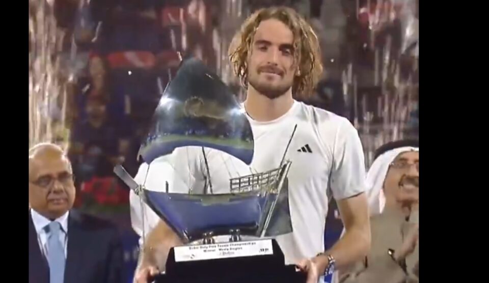 Well-deserved moment 🏆👏@steftsitsipas raises the Dubai trophy for the first time, after his 3rd Dubai final!#DDFTennis pic.twitter.com/ew72tLVdt1