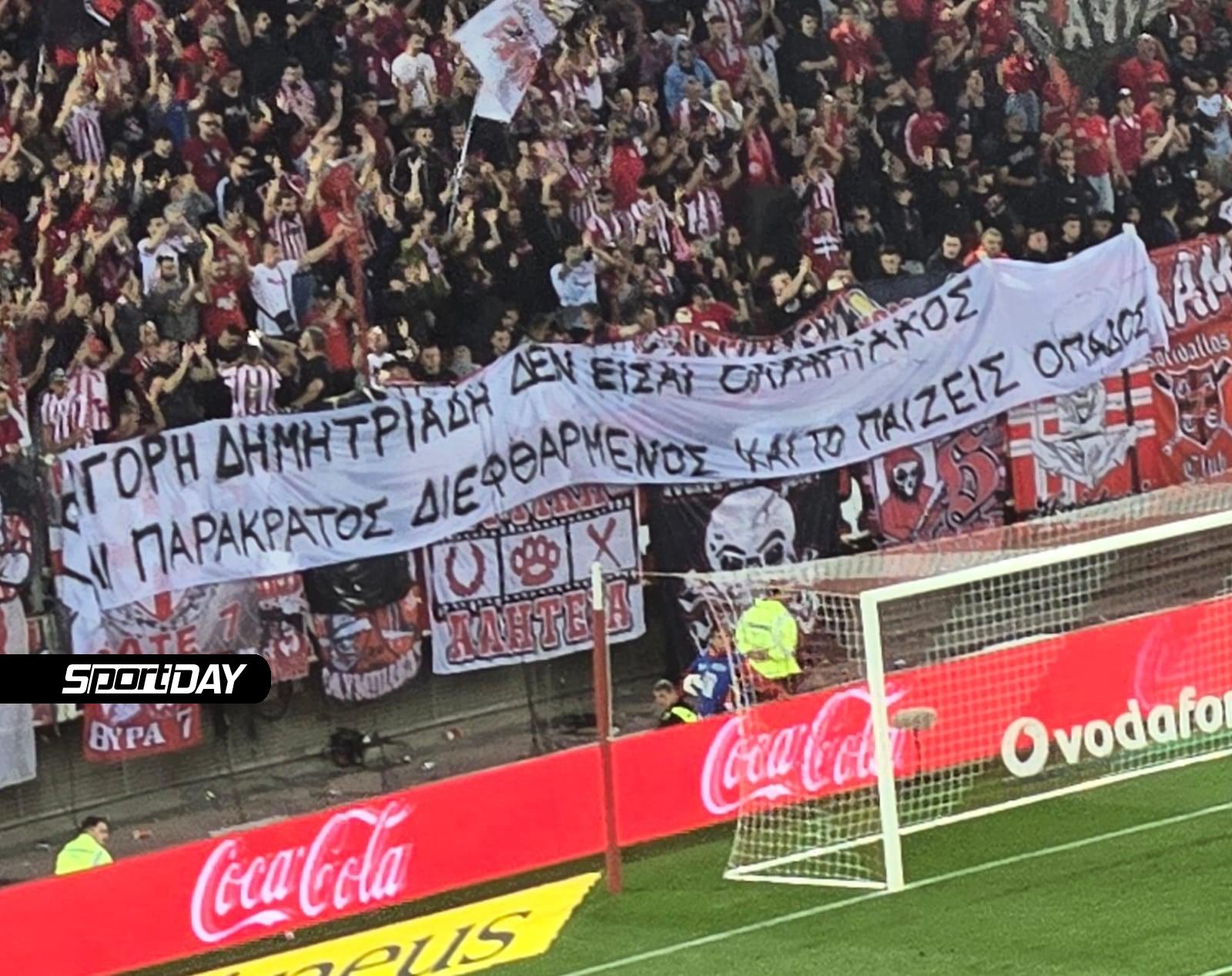 Πανό με συγκεκριμένο αποδέκτη αναρτήθηκε στη Θύρα 7 από τους φίλους του Ολυμπιακού. Μέσω αυτοί, οι οπαδοί των ερυθρόλευκων έκαναν σαφές πως ο Γρηγόρης Δημητριάδης είναι ανεπιθύμητος.