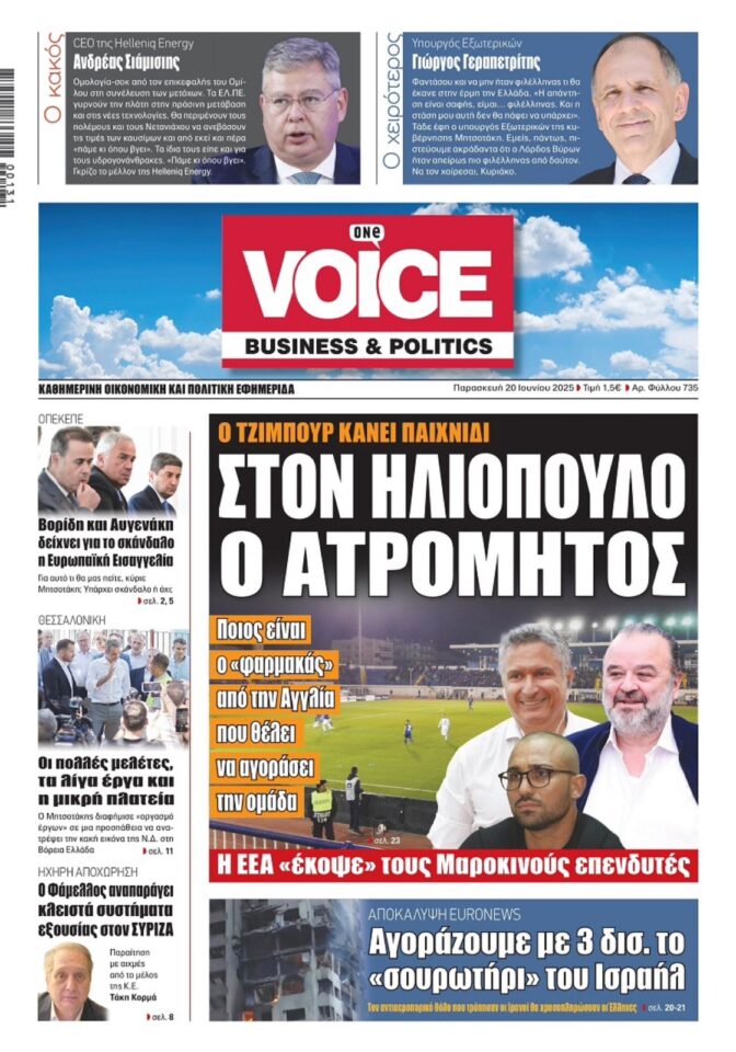 Μόνο ως βόμβα δεν έσκασε στην ποδοσφαιρική πιάτσα το χθεσινό πρωτοσέλιδο πολιτικής και οικονομικής εφημερίδας (κάτω φωτό), σύμφωνα με τη οποία, ο Ατρόμητος περνάει στον έλεγχο του Ηλιόπουλου. «Ο Τζεμπούρ κάνει παιχνίδι», υποστηρίζει το ρεπορτάζ και επίσης αναφέρει ότι «η ΕΕΑ «έκοψε» τους Μαροκινούς επενδυτές» και αποκαλύπτει «ποιος είναι ο “φαρμακάς” που θέλει να αγοράσει την ομάδα» του Περιστερίου.