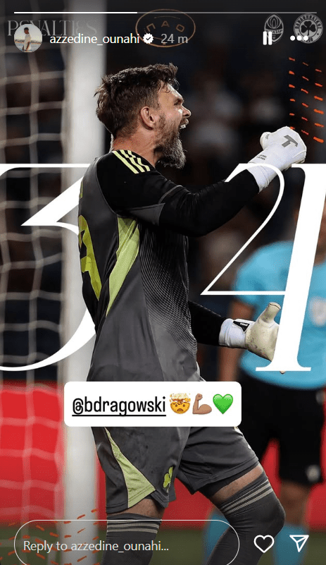 Ο Μαροκινός μέσος προχώρησε σε μια δημοσίευση στo instagram μετά την πρόκριση επί της Σαχτάρ. Ανέβασε το post της ΠΑΕ και έκανε tag τον… ήρωα Ντραγκόφσκι με μια πράσινη καρδιά.