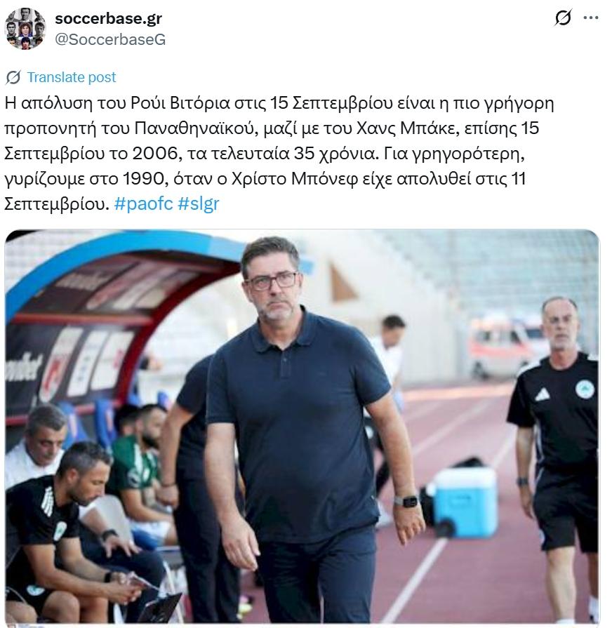 Η απόλυση του Ρούι Βιτόρια στις 15 Σεπτεμβρίου είναι η πιο γρήγορη προπονητή του Παναθηναϊκού, μαζί με του Χανς Μπάκε, επίσης 15 Σεπτεμβρίου το 2006, τα τελευταία 35 χρόνια.