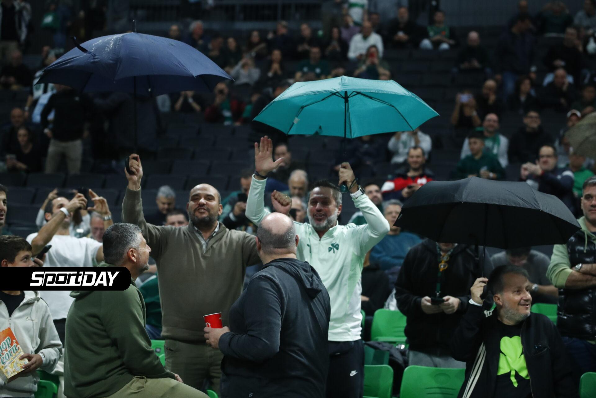 Στις εξέδρες του γηπέδου έκαναν την εμφάνισή τους… ομπρέλες, με φιλάθλους να τρολάρουν τον «αιώνιο» αντίπαλο για τις εικόνες ντροπής στο ΣΕΦ με τους μουσαμάδες. Ειρήσθω εν παρόδω, όπως είδαμε οι μουσαμάδες που τοποθετήθηκαν στο ΣΕΦ για να μη βραχεί το παρκέ, πληρώθηκαν από το ελληνικό κράτος. Συγκεκριμένα, με απόφαση της 11ης Νοεμβρίου που αναρτήθηκε στην Διαύγεια, το ΣΕΦ απέκτησε με κρατικά χρήματα τους περιβόητους μουσαμάδες που κόστισαν περίπου 15.000 ευρώ (14.800 συγκεκριμένα).