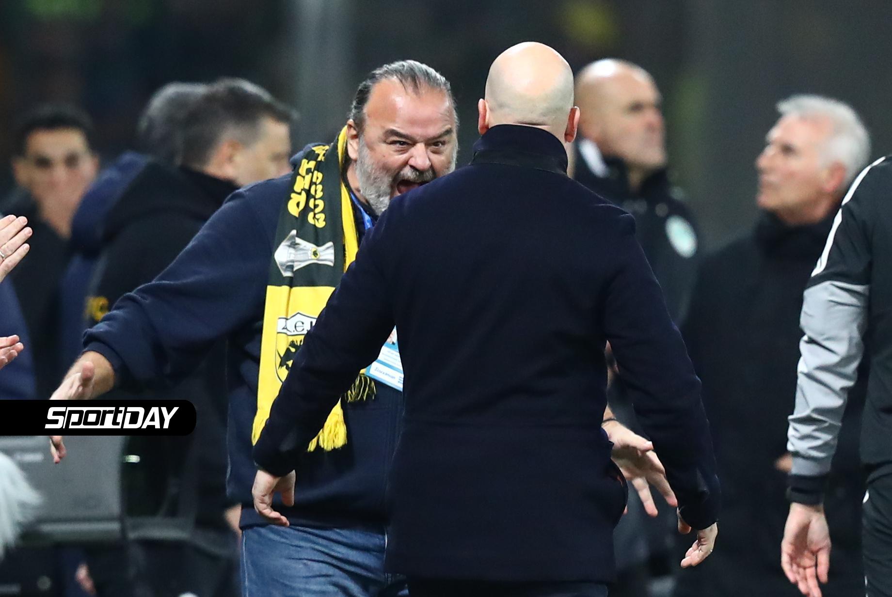 Το αφεντικό της ΑΕΚ αγκάλιασε τους παίκτες και τον Νίκολιτς, ενώ όταν ο Βίντα τον πλησίασε και του είπε για το πρόστιμο, ο «Super Mario» του υπενθύμισε με τα δάχτυλα πως θέλει ακόμα δύο νίκες.