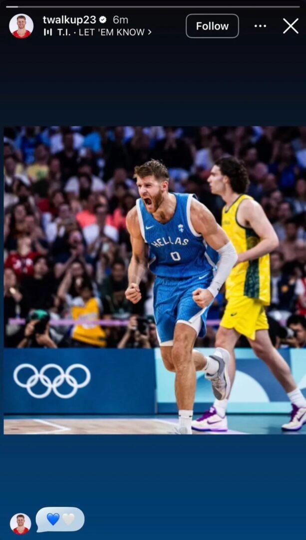 Λίγο αργότερα, ο Γουόκαπ ανάρτηση μια φωτογραφία του με τη φανέλα της Εθνικής Ελλάδας από αγώνα κόντρα στην Αυστραλία στους Ολυμπιακούς Αγώνες του 2024.