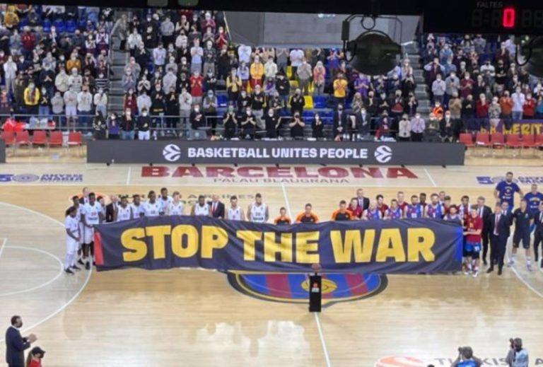 ΜπάσκετEuroleague Μπαρτσελόνα - Μονακό: Με πανό «Stop The War» τα μέλη των δύο ομάδων στην παρουσίαση