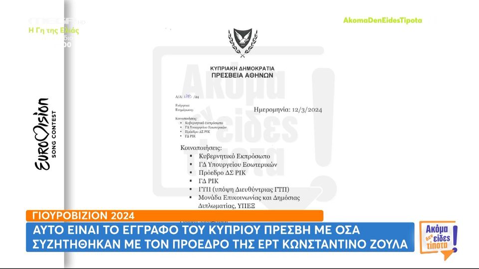 Eurovision: Το έγγραφο του Κύπριου πρέσβη για τη στάση της ΕΡΤ στην κυπριακή συμμετοχή