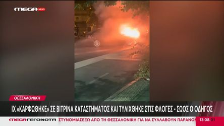 VideosΕκτός Γηπέδων Θεσσαλονίκη: ΙΧ "καρφώθηκε" σε βιτρίνα καταστήματος και τυλίχθηκε στις φλόγες - Σώος ο οδηγός