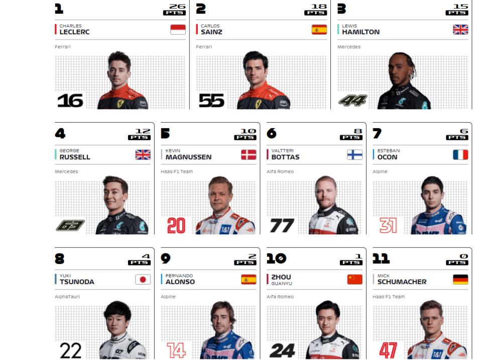 Η βαθμολογία των 10 πρώτων οδηγών μετά το πρώτο GP: