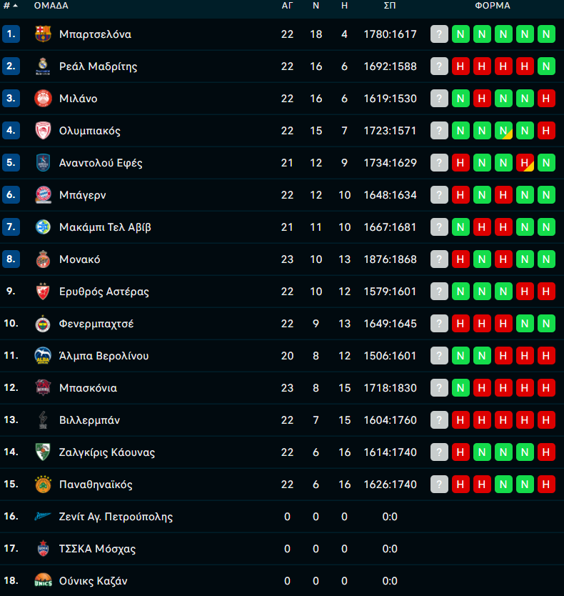 Βαθμολογία Euroleague: Κερδισμένος ο... Ολυμπιακός από τις ήττες Ρεάλ και Εφές