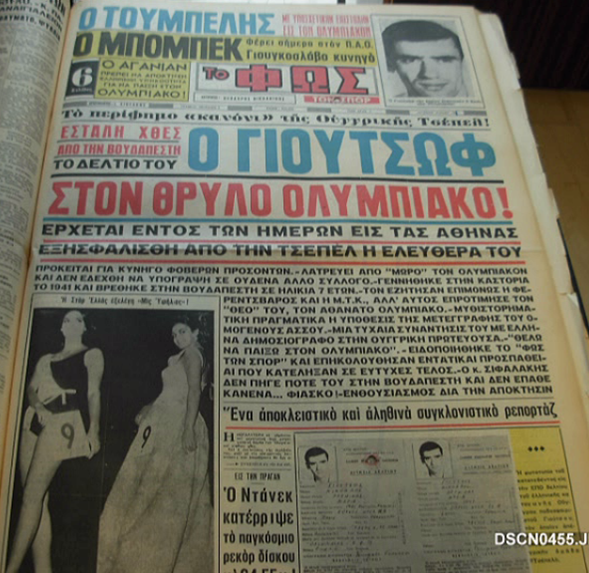 Ο τελευταίος με παρότρυνση και ενέργειες του πατριάρχη της αθλητικής δημοσιογραφίας ταξίδεψε στη Βουδαπέστη, χρησιμοποίησε τις επαφές του ξαδέλφου του, σύμβολου της ελληνικής αντίστασης κατά των Ναζί, Μανώλη Γλέζου, που είχε δίοδο επικοινωνίας με την Ουγγαρία και έπεισαν τον Γιουτσώφ να φορέσει τη φανέλα του Ολυμπιακού το 1964. Μάλιστα παρασκήνιο της εποχής αναφέρει πως το διαβατήριο του είχε φωτογραφία… κομμένη από ουγγρική εφημερίδα.