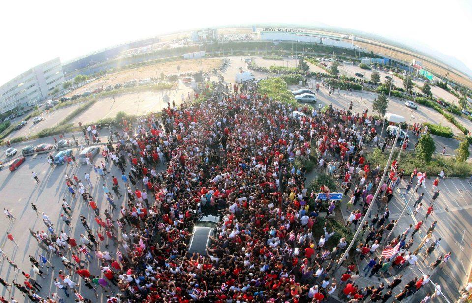 Ήταν 22 Ιουλίου όταν ο Άλμπερτ Ριέρα έφτανε στην Ελλάδα. Αν και κατακαλόκαιρο, στο «Ελευθέριος Βενιζέλος» είχαν μαζευτεί πάνω από 2.000 οπαδοί του Ολυμπιακού να τον υποδεχθούν με καπνογόνα και συνθήματα. Μάλιστα, παρά την καθυστέρηση 45 λεπτών σ’ εκείνη την πτήση, κανείς δεν πτοήθηκε να φύγει. Οταν έκανε την εμφάνισή του ο παίκτης γνώρισε αποθέωση. Μαζί ήταν και η σύζυγός του που απαθανάτιζε τις στιγμές με το κινητό της. Αμέσως επιβιβάστηκαν σε αυτοκίνητο της ΠΑΕ Ολυμπιακός που τους περίμενε και χρειάστηκε αρκετή ώρα να πέρασουν μέσα από το πλήθος μέχρι να φύγουν για το ξενοδοχείο.